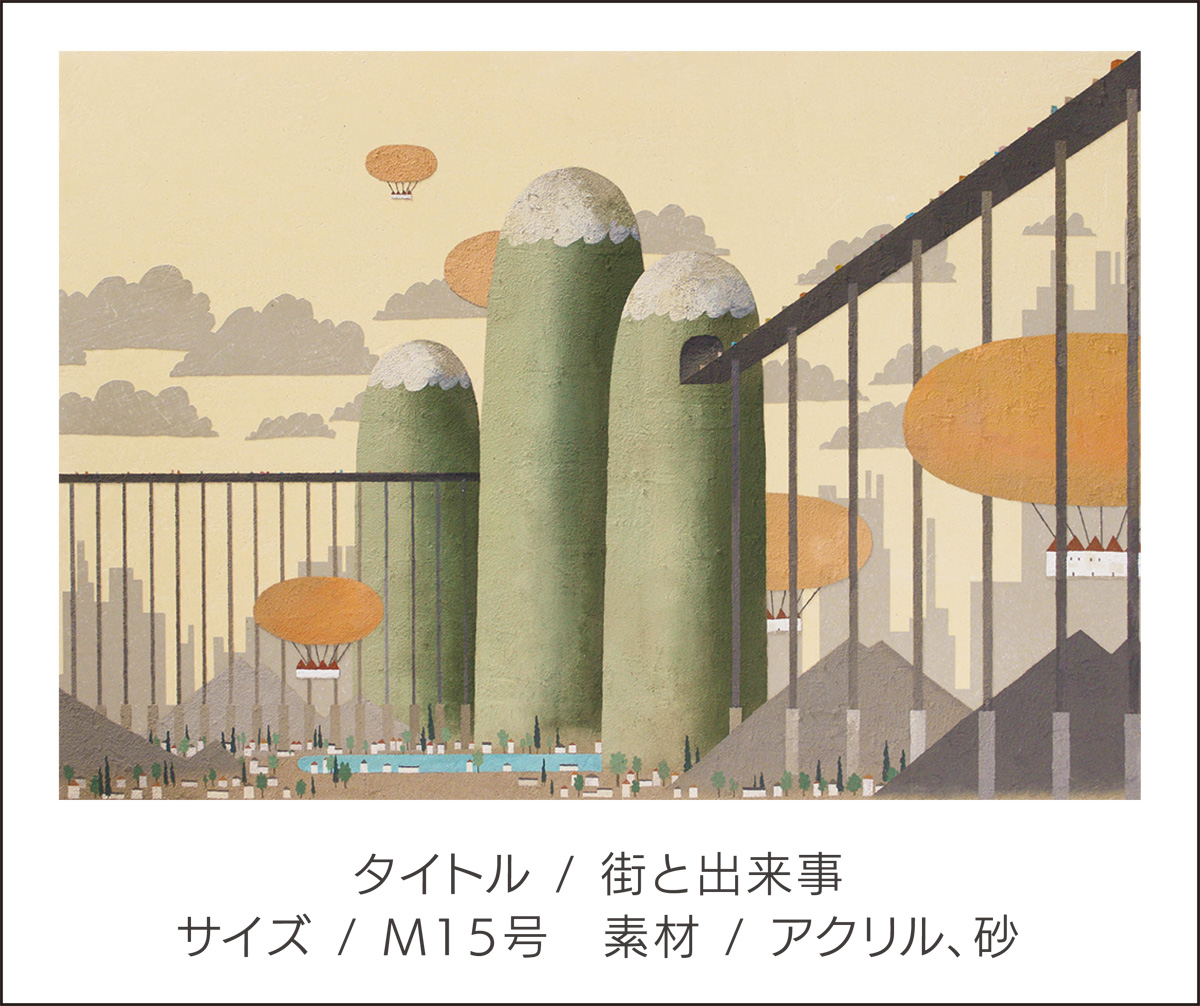 砂とアクリル絵具を混ぜて描く作品が特徴。建物が好きなことから、直線を生かして架空の街を生み出している高橋さん。不思議な雰囲気でありながら、どこか懐かしい作風について、「余白などの“抜け”を作ることで、創造力を入れ込む余地を作っている」と高橋さん。