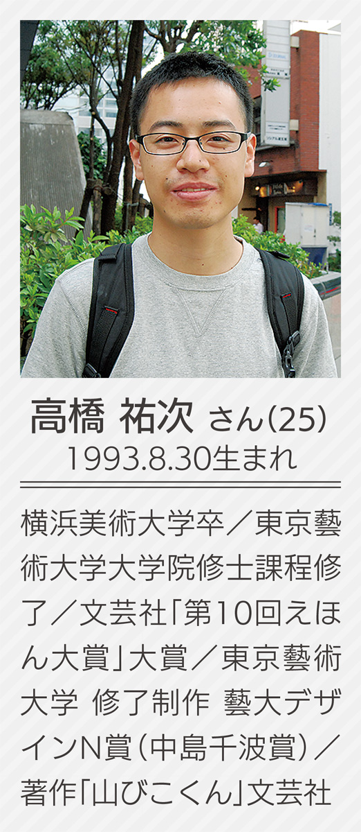 第1弾の今回は、横浜美術大学出身の高橋祐次さん(25)。同大卒業制作で金兎賞、文芸社第10回えほん大賞を受賞し、「山びこくん」を出版した経歴を持つ。その後、東京藝術大学大学院修士課程を修了し、現在は百貨店で個展を開くなど活躍の場を広げている。