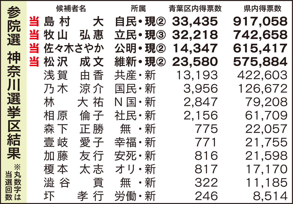 参議院議員選挙の投開票が7月21日に行われた。4議席を14人が争った神奈川選挙区は、自民党の島村大氏(58)が約91万7千票を獲得し、トップ当選。以下、立憲民主党の牧山弘惠氏(54)、公明党の佐々木さやか氏(38)、日本維新の会の松沢成文氏(61)が当選し、現職4人が議席を守った。青葉区でも島村氏がトップで、約3万3400票を獲得した。