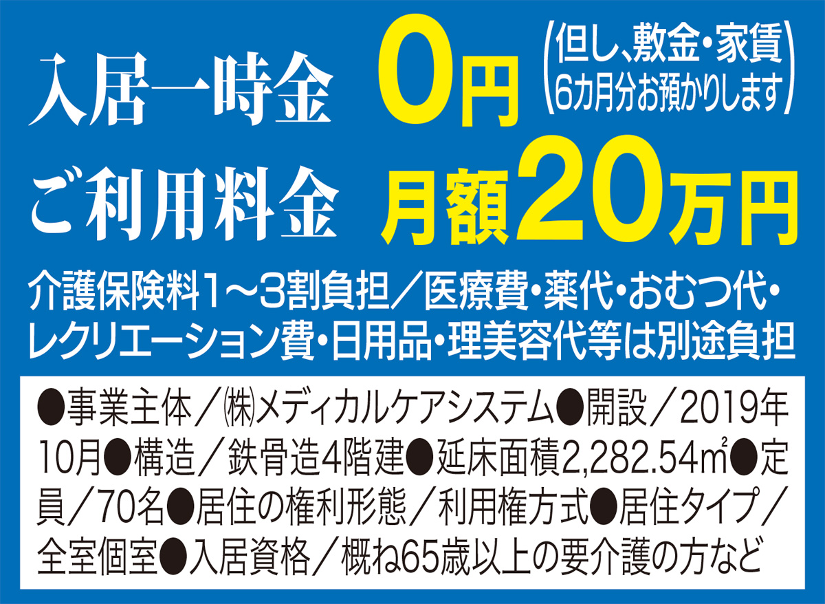 医療面でも近隣にある医療機関と密に連携を取り、医師が定期的に診療するほか日中看護師が複数名常駐し毎日の健康管理を行う。月額利用料は低価格を実現。資料請求、相談は左記へ。お早めに。