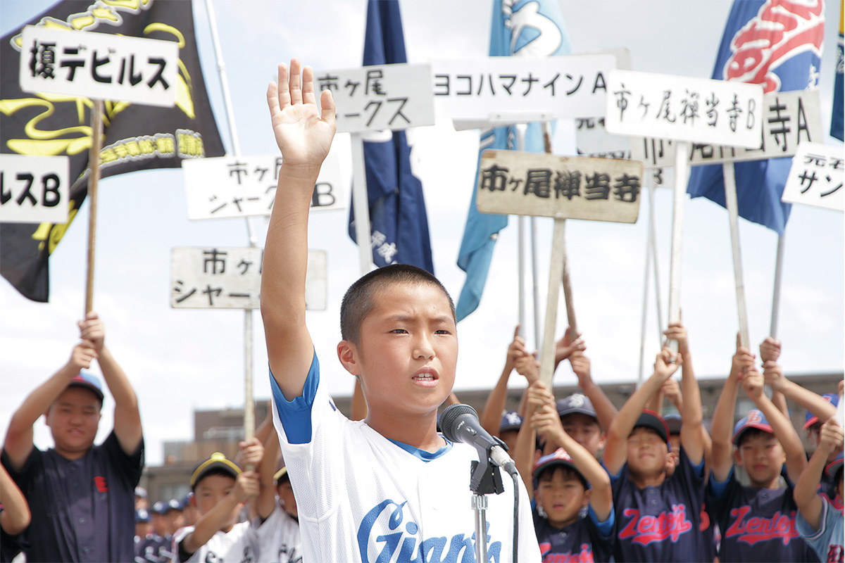 選手宣誓を務めたのは第49回大会Aクラス優勝チーム「横浜ジャイアンツ」主将、前田昌臣君=写真。前田君は「野球ができる嬉しさを胸に、日ごろの練習の成果を十分に発揮し、仲間と共に全力プレーで最後まで戦い抜くことを誓います」と力強く宣言していた。