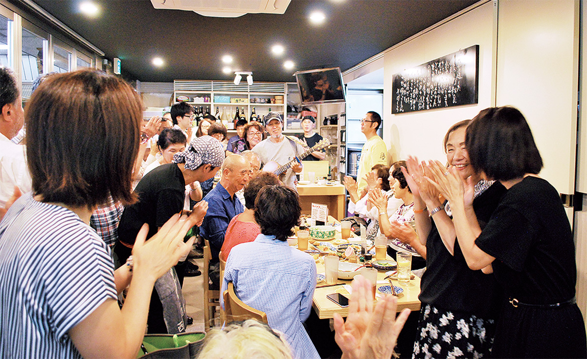 当日は、長田さんの呼びかけなどで店内からあふれるほどの60人以上が参加。堅苦しい雰囲気はなく、食事をしながらそれぞれの活動内容を紹介したり、日本酒の差し入れがあったり、時にはギターの演奏で盛り上がるなど賑やかな夜となった。