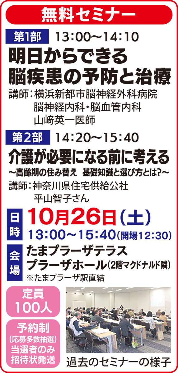 寝たきりや認知症の主な原因となる脳卒中など「脳疾患」の怖さを正しく知り、予防と治療法を専門医に学ぶ無料セミナーが10月26日(土)、たまプラーザテラスで開かれる。主催は三井不動産リアルティ(株)。