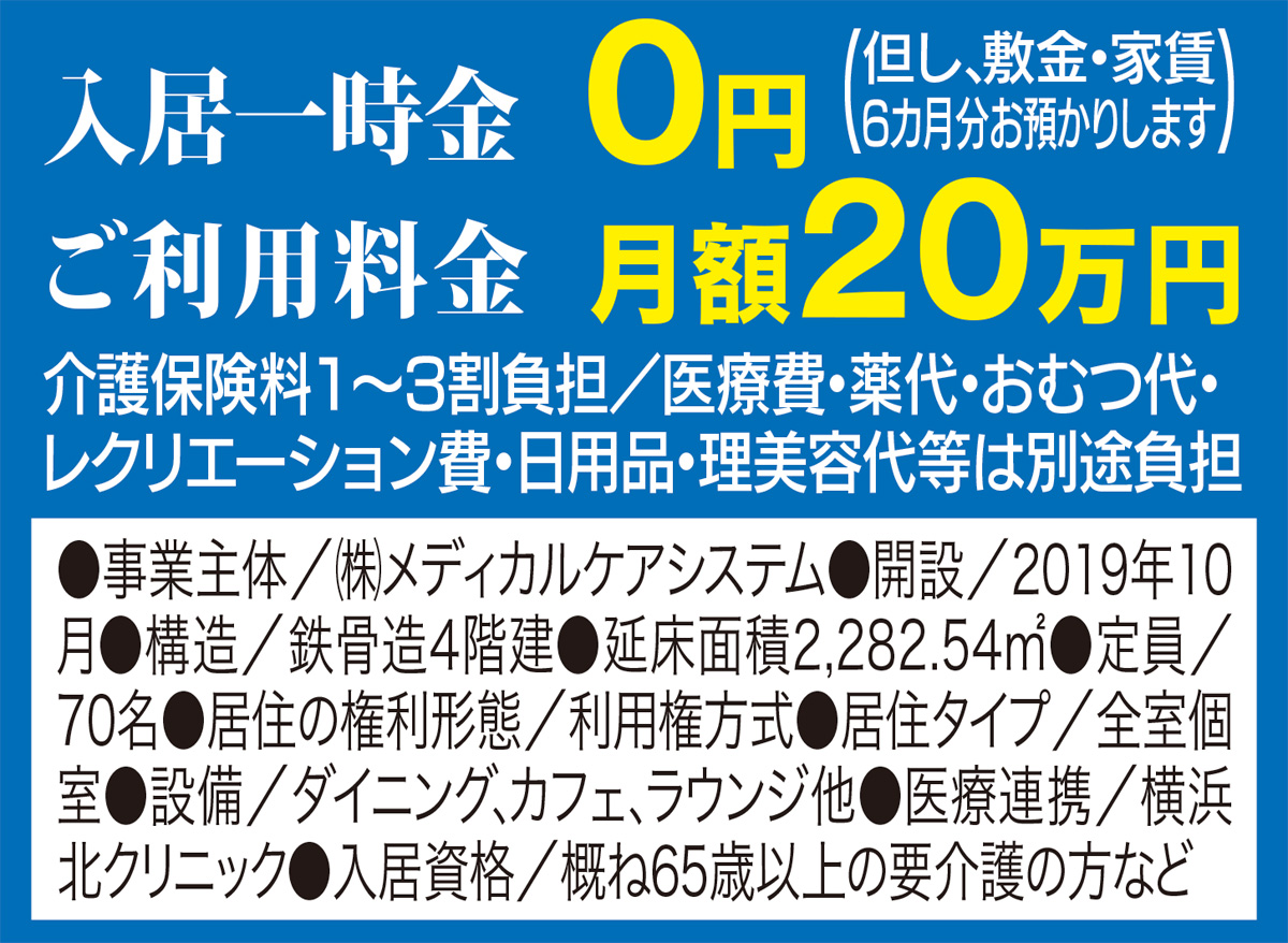 医療面でも横浜北クリニックと密に連携を取り、医師が定期的に診療するほか、日中看護師が複数名常駐し毎日の健康管理を行う。月額利用料は低価格を実現。資料請求、相談は左記へ。お早めに。