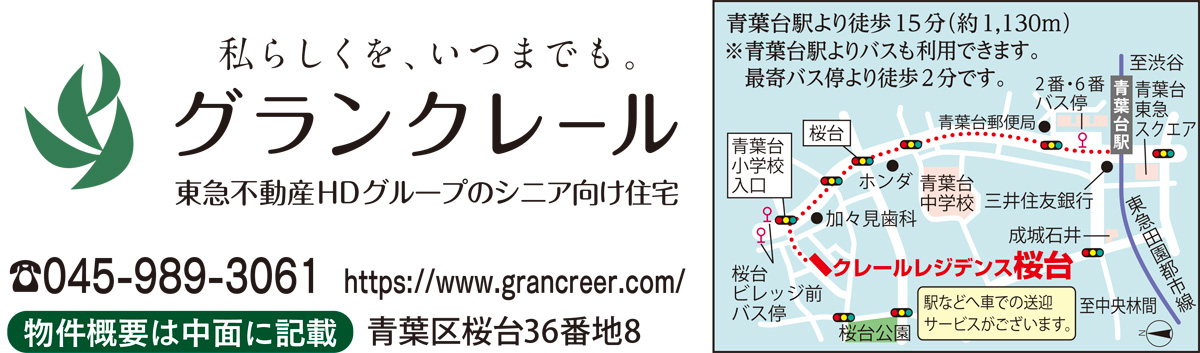 「クレールレジデンス桜台」は東急不動産HDグループが運営する、元気なシニアのための住まい。これからの時期は紅葉が美しい桜台公園にほど近く、店舗が多い青葉台駅周辺も徒歩圏という人気住宅だ。