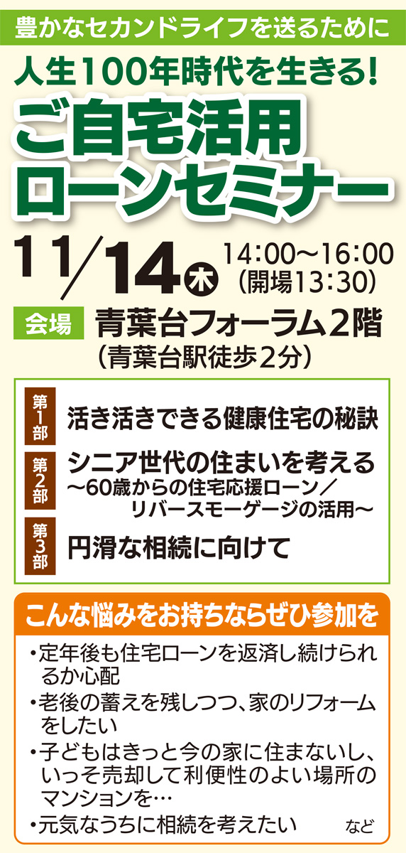 「人生100年時代」の老後資金や自宅の心配を解決し、豊かなセカンドライフを送る方法として注目される「リバースモーゲージ」について学ぶ無料セミナーが11月14日(木)、青葉台フォーラムで行われる。積水ハウス(株)の主催。