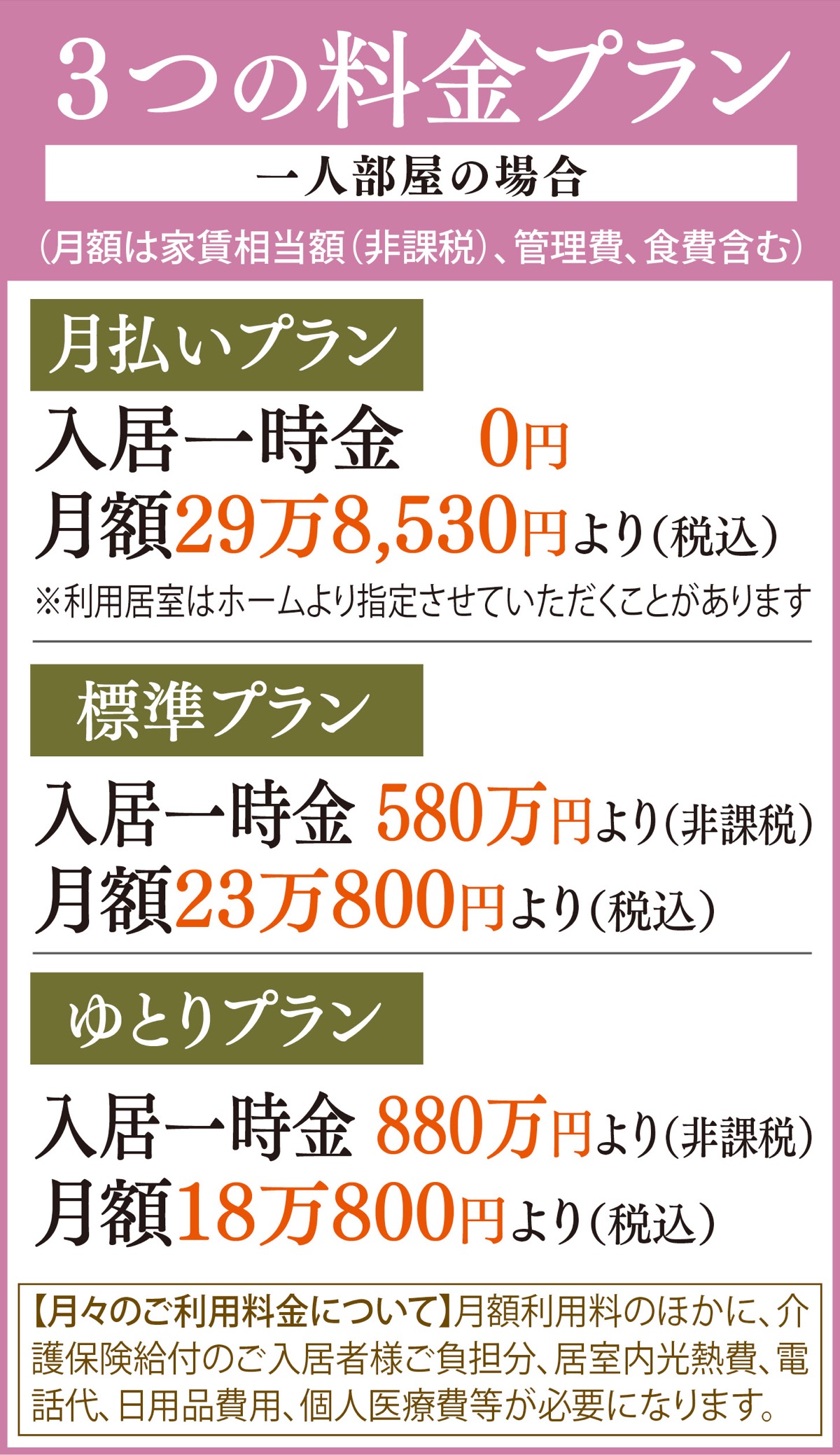 入居しやすい施設づくりの一つとして、このほど料金プランを刷新。入居一時金なしで月額利用料のみで入居できる「月払いプラン」や、標準プランよりも月々の負担を軽減できる「ゆとりプラン」を設定した。