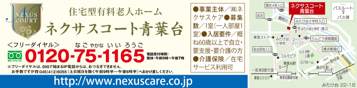 心から安心できる住まいを――。みたけ台の緑豊かなケヤキ並木に隣接する住宅型有料老人ホーム「ネクサスコート青葉台」が今年10周年を迎えた。広く日当たりのよい南向きの部屋は、快適な「第二の我が家」として利用者に安らぎの空間を提供している。