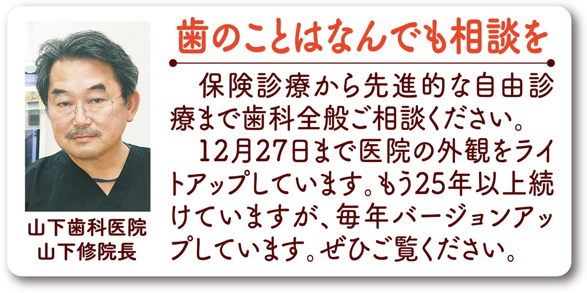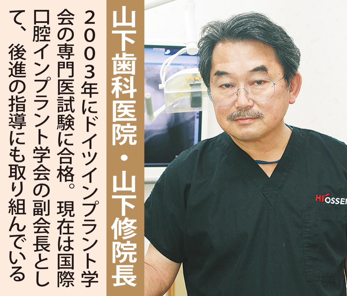 山下院長は国際口腔インプラント学会の副会長であり、日本で治療法を普及させたプロフェッショナル。同院では治療時にタンパク分解型除菌水を用いることで感染予防はもちろん、回復を早めて患者の負担軽減を図っている。また、インプラントの歯周病とも言える「周囲炎」対策など、オペ後のメンテナンスにも力を尽くすのが特徴だ。