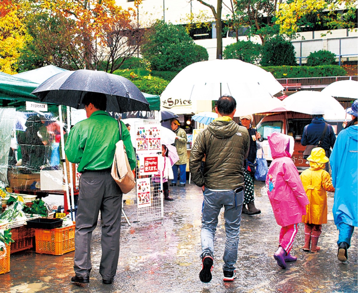 あいにくの天候の中でも多くの人が来場。地産地消やエコをテーマに、飲食店など様々なブースが出店し、にぎわっていた。主催者は「雨の中でもこれだけにぎわい、マイカップを持参してくれる人も多かった。他のイベントでもエコの取組みが広がれば」と話した。