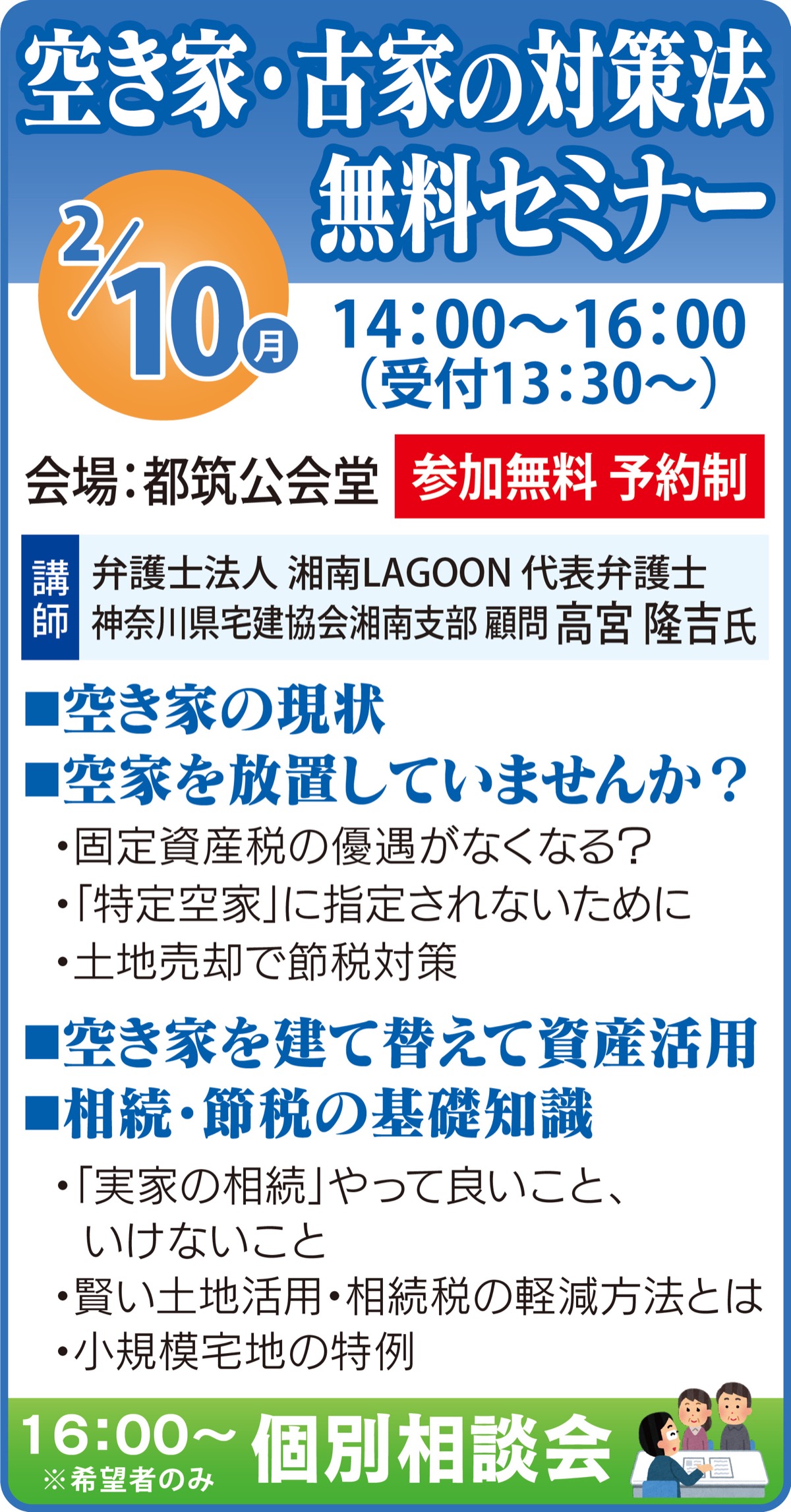 「親が介護施設に入って実家が空き家に」「相続したが誰も住んでいない」など、今、増加しているといわれる空き家問題。放置しておくと倒壊の危険性や子世代に相続時に思わぬ税金がかかることも。これを受け旭化成ホームズでは、空き家対策の無料セミナーを開催する。当日は、講師に弁護士を迎え、空き家の現状や放置した際の弊害などを説明。指定されると大きなデメリットとなる特定空家について学ぶほか、空き家の対処法、建て替えて資産として活用した事例紹介から相続・節税の基礎知識まで、わかりやすく解説する。相続で後悔する前にぜひ参加を。
