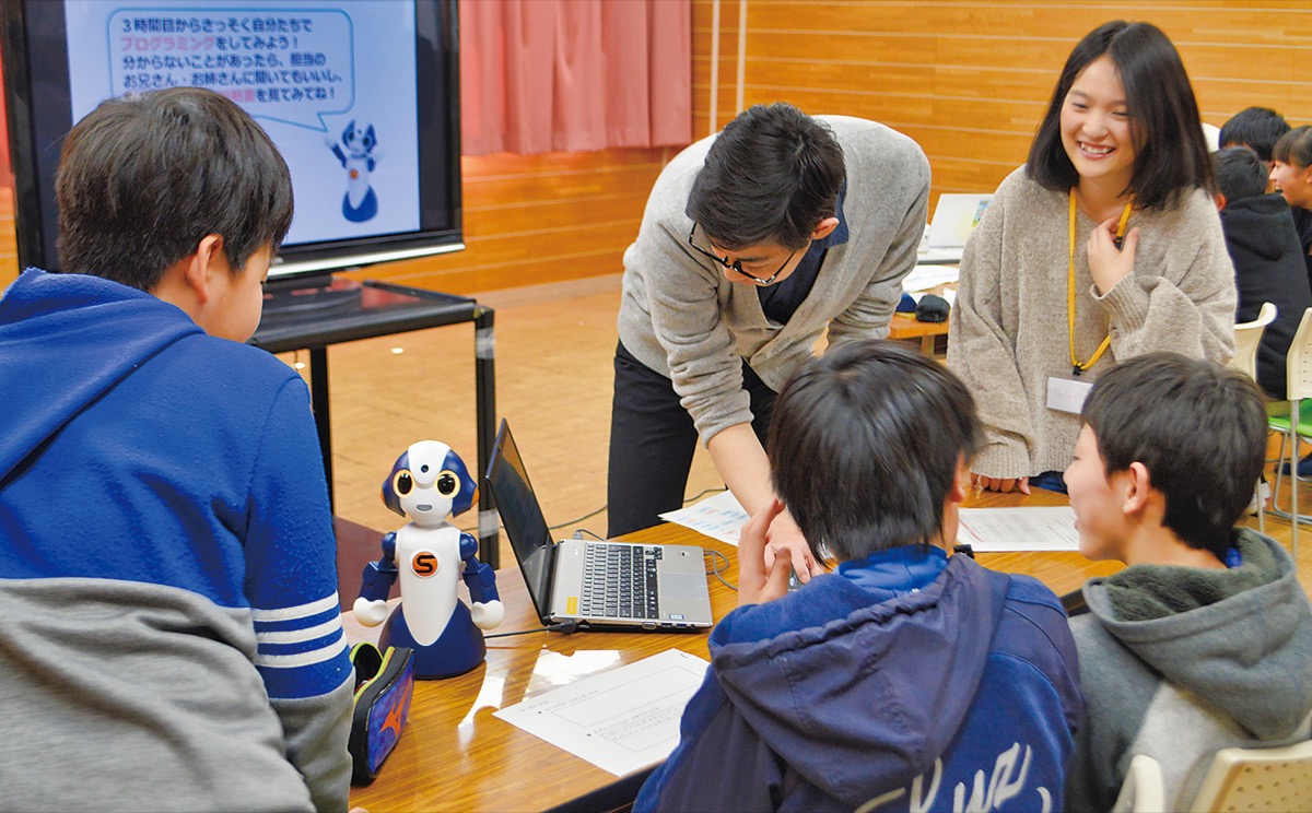 当日は同社のサービスでも扱うクラウド型のコミュニケーションロボット「Sota(ソータ)」を使って授業を実施。学生が操作を説明した後、児童がグループごとにパソコンで専用ソフトによるプログラミングに挑戦した。