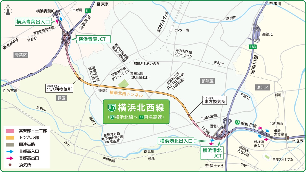 2017年3月に開通した横浜北線(第三京浜道路・横浜港北ジャンクション※以下JCTから首都高横羽線・生麦JCT)と直結する路線として、東名高速道路・横浜青葉JCTと第三京浜道路・横浜港北JCT間を結ぶ、延長約7・1Km(内トンネル部約4・1Km)の便利な路線だ。