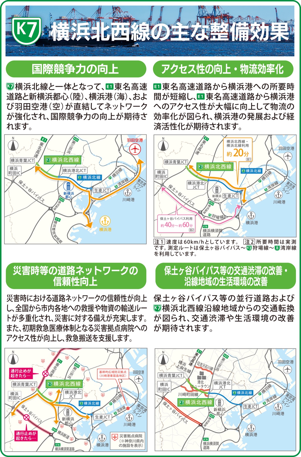 アクセス性向上では、東名高速道路から保土ヶ谷バイパス、狩場線、湾岸線を経由して横浜港へ向かう場合、これまで約40分から60分かかっていた所要時間が、北西線と北線を経由すれば約20分と大幅短縮される。