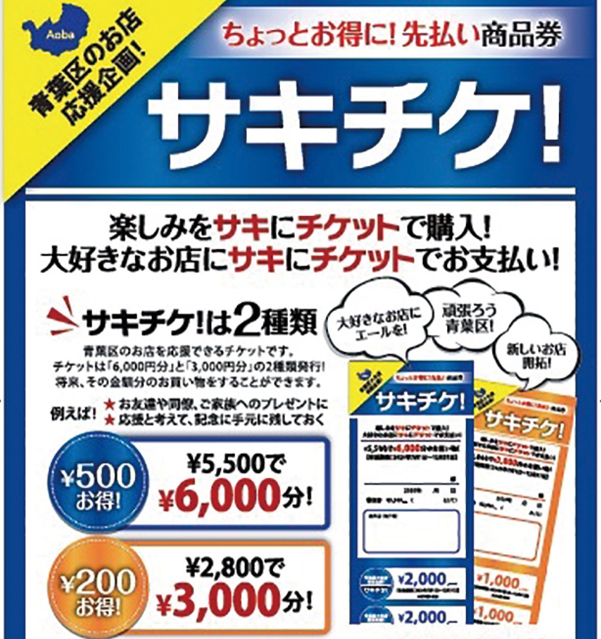 新型コロナウイルスの影響で、休業や営業時間短縮している青葉区内の飲食店などを応援しようと、先に代金を支払い、後日、お得に使うことができる「サキチケ!」と名付けられた先払い商品券の販売がこのほど始まった。
