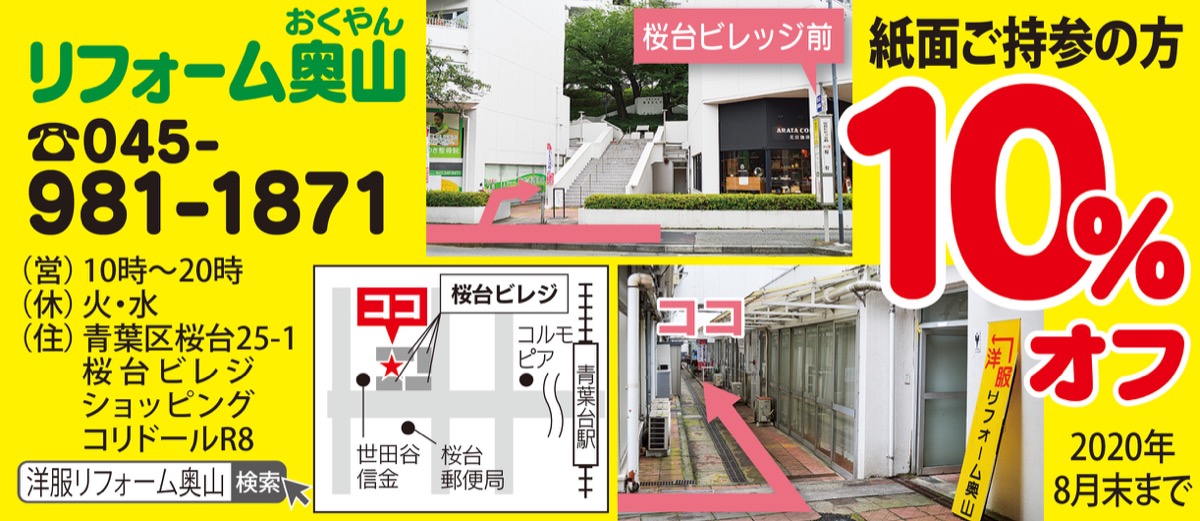 洋服のサイズ直しや肩幅調整、修理・リフォームなど、手持ちの洋服で「困った…!」という時、頼りになるのが桜台のリフォーム奥山(おくやん)。これまで商店街の通りに面していた同店は今年2月、桜台ビレジ内のコリドールに移転=地図参照。今なら8月末まで本紙持参で各お直しメニューが10%オフに。