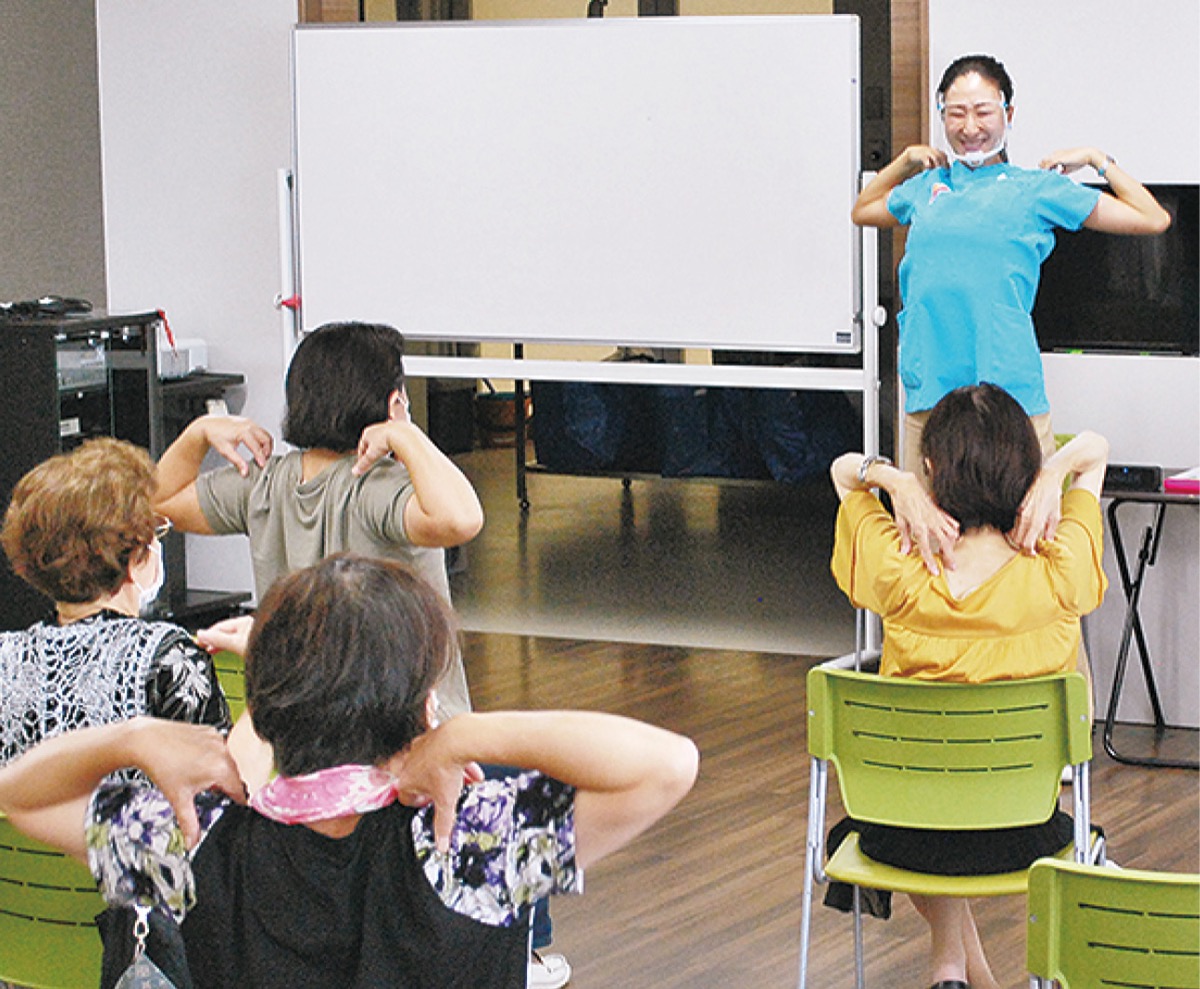 今回講師を務めたのはフィットネスライフアドバイザーの森口尚子さん=写真右奥。「脳の活性化の効果」をテーマに、約20人の参加者が森口さん考案の椅子を使った「ナイス体操」に挑戦。体を動かすことで脳を活性化する効果や運動の大切さを学んだ。森口さんは「コロナ禍でも工夫して体を動かすことが大切。ナイス体操で心と体をポカポカ温めてもらえたら」と話した。