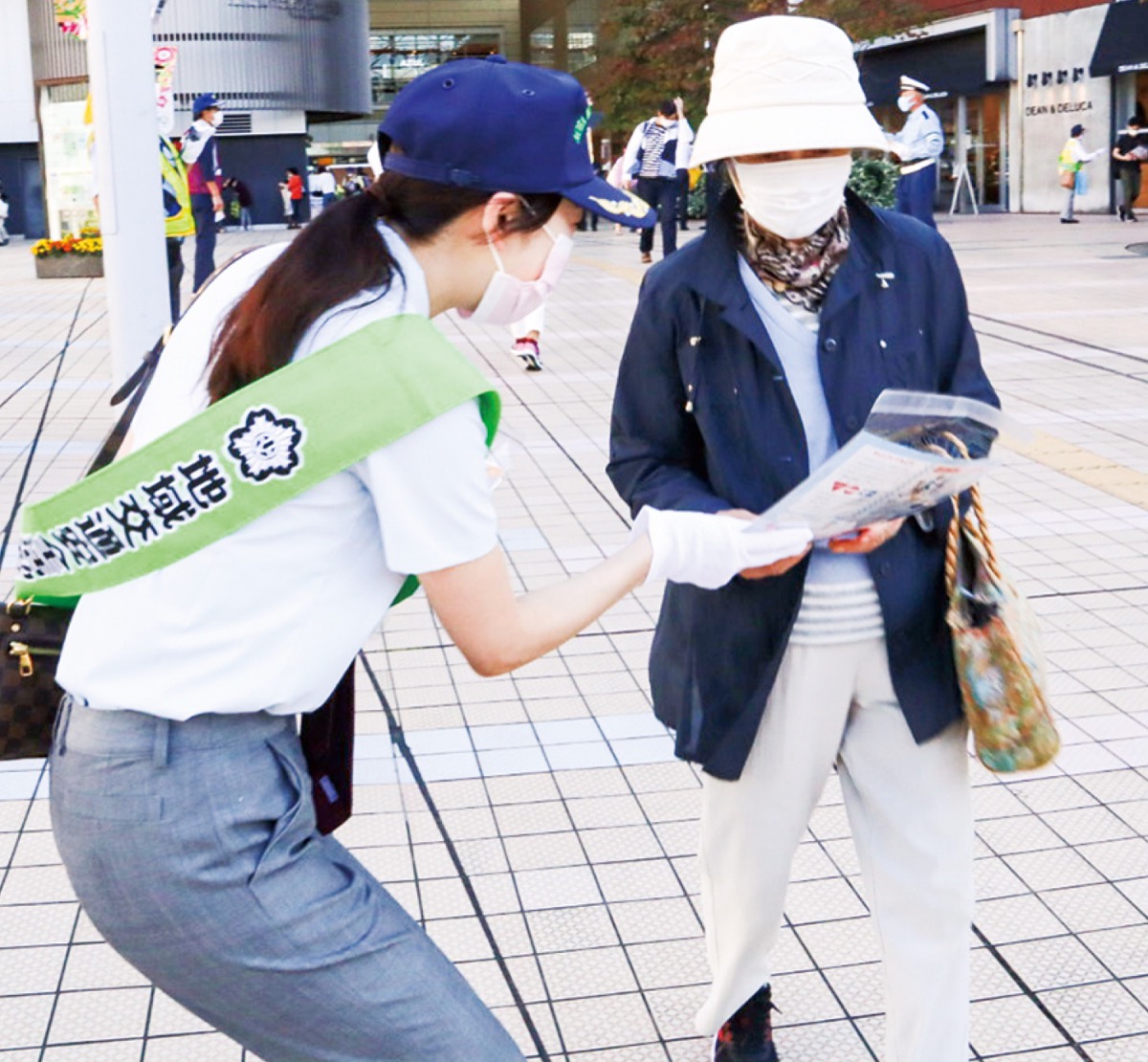 「交通事故死ゼロを目指す日」の9月30日、たまプラーザ駅前で青葉警察署員らが交通ルール順守の呼び掛けを行った。
