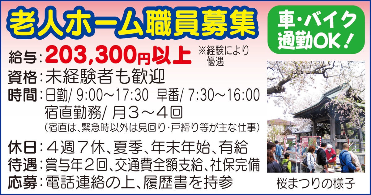 自立したお年寄りが暮らす老人ホーム「ルンビニ合掌苑」で入居者をサポートする正職員を募集。仕事内容は、お年寄りの話し相手や、催し物・クラブ活動の手伝い、施設内共用部分の清掃、入居者の通院・買い物等の送迎など。