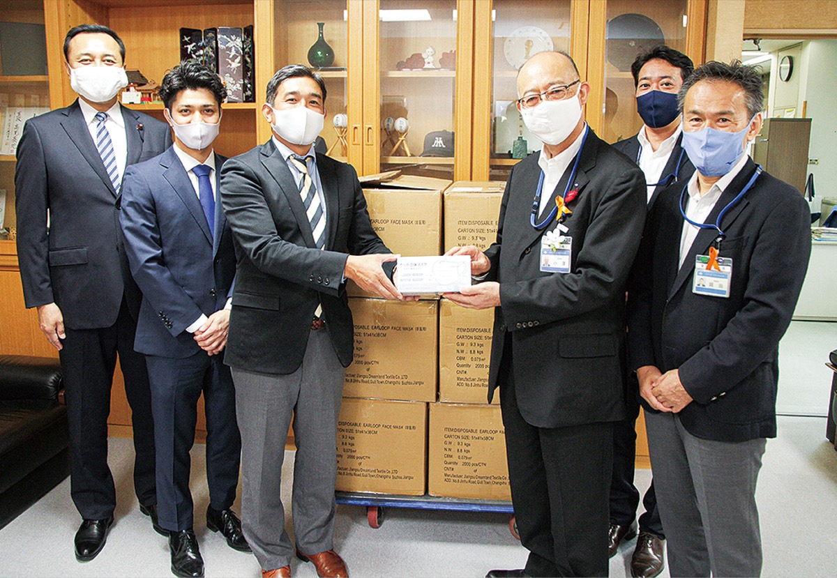 当日は小澤明夫区長にマスクを手渡し。区役所内の各窓口や保育園で使われるほか、防災用として備蓄されるという。