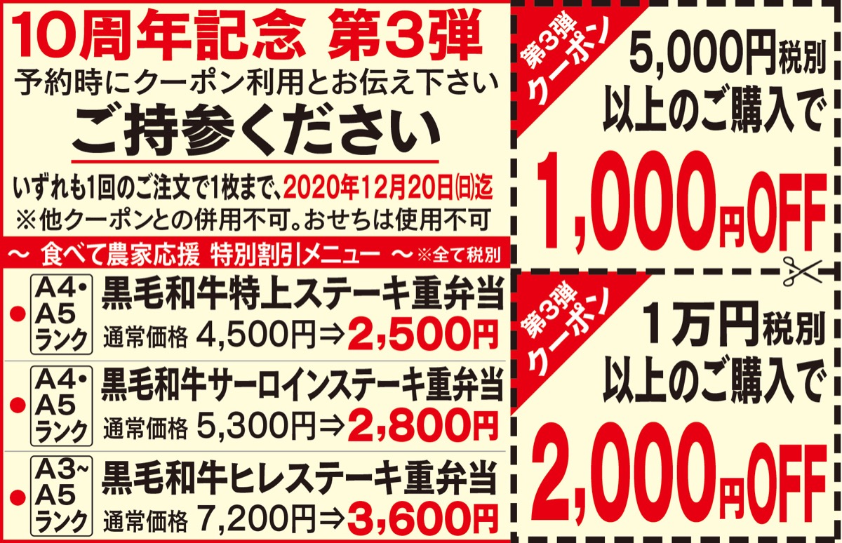この他10周年記念・特別企画第3弾として通常テイクアウトで使える下記クーポンも。おせち・テイクアウト共にGo To Eat食事券が利用可能。全て事前【電話】予約制。
