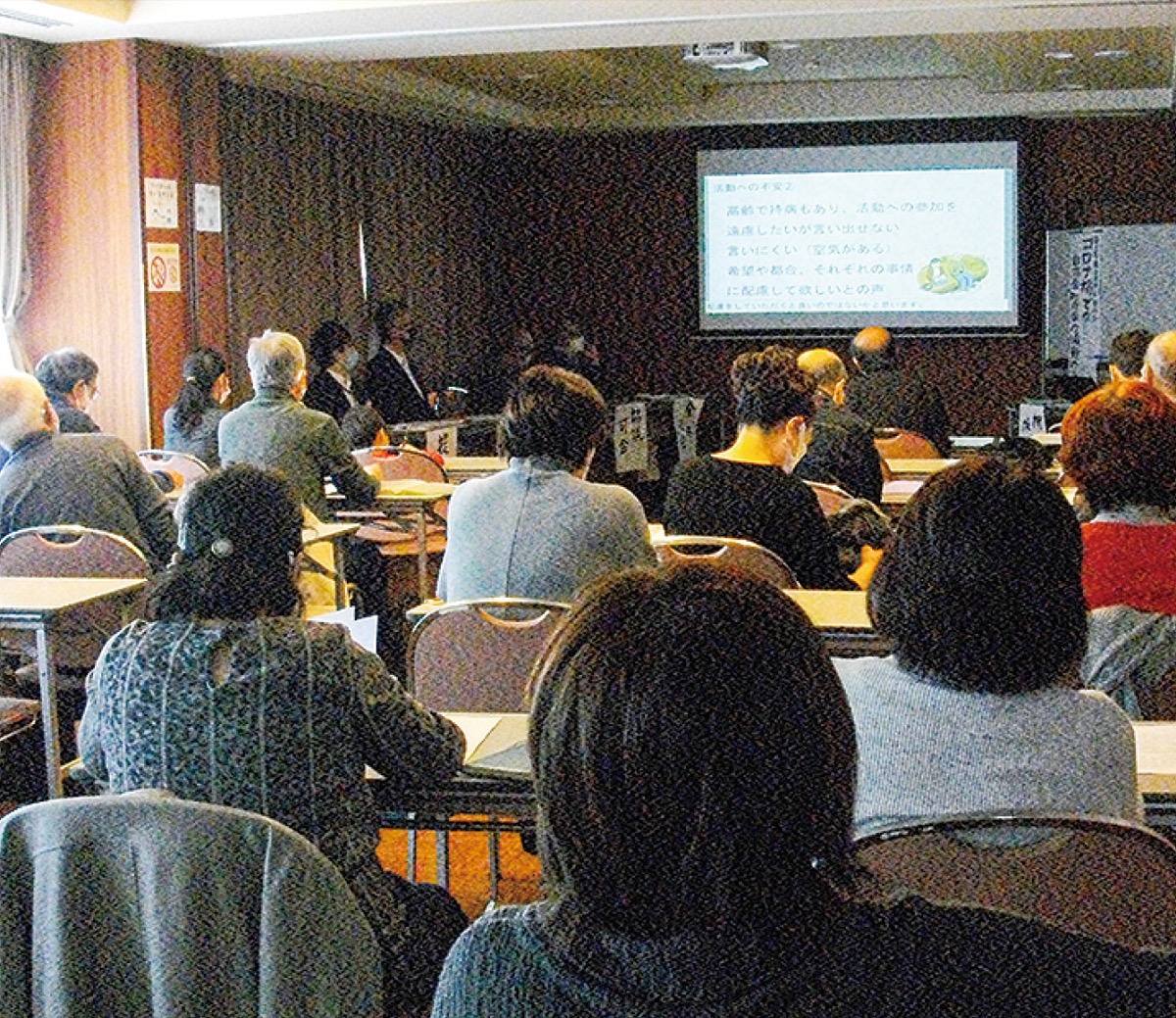 区役所から提供された、コロナ禍での自治会・町内会活動について学ぶDVDを活用し、研修会として設定したという同連合。当日は新型コロナウイルスの感染症対策のもと約30人が参加し、まちづくりコンサルタントの水津陽子氏による講演を記録したDVDを視聴。オンラインでの役員会やコミュニケーションアプリ「LINE」を利用した活動事例などに耳を傾けていた。