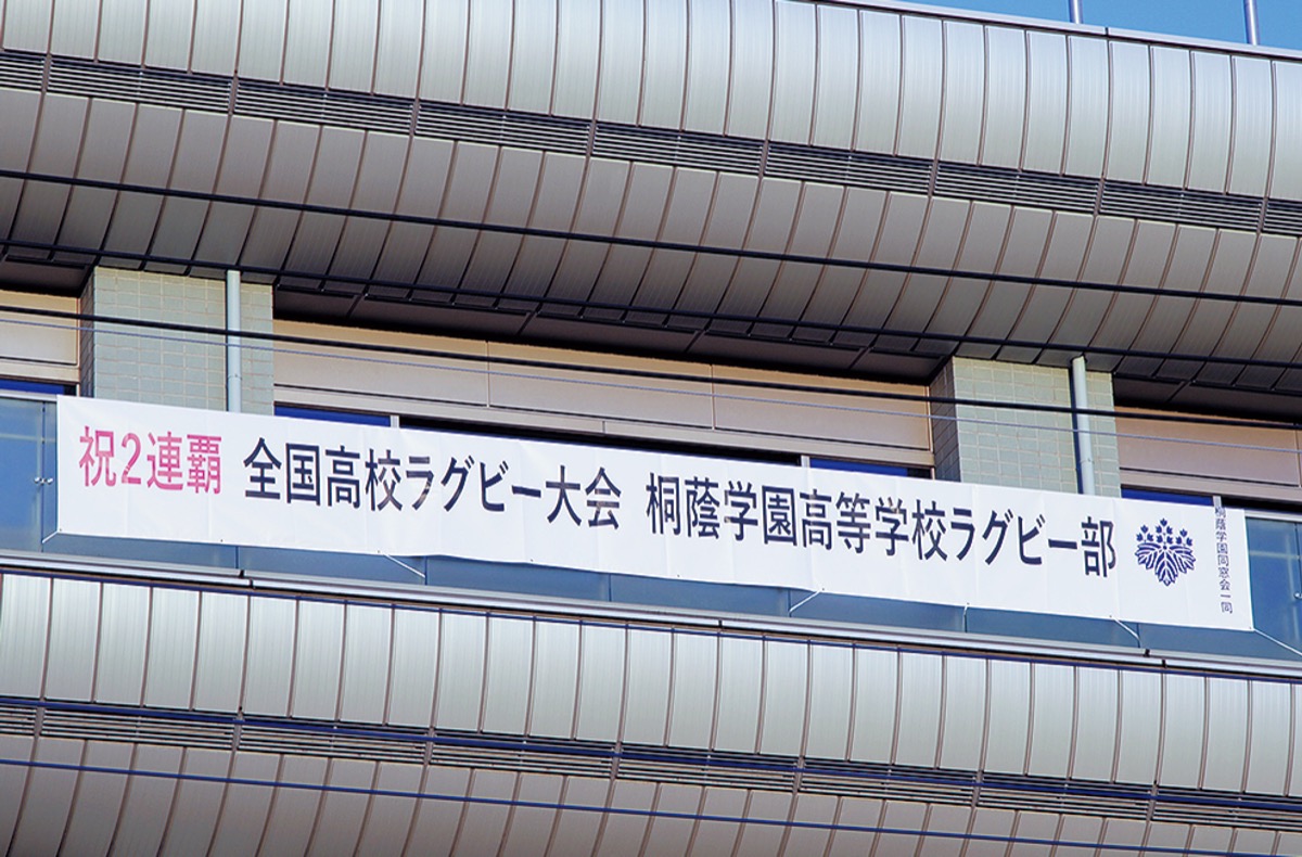 桐蔭学園高校ラグビー部が先ごろ行われた全国高校ラグビー大会で連覇したことを受け、桐蔭学園同窓会「桐蔭会」と卒業生有志が1月29日、青葉区役所に記念の横断幕を掲げた=写真。