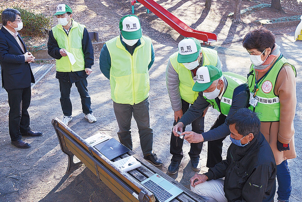 市ケ尾町の鶴蒔公園横の通りについて、夜道に人の目が届かず、地域の中高生たちから通るのが怖いという声が上がっていたことから、下市ヶ尾町内会が防犯カメラを公園内に設置。1月22日に専門業者の立ち合いのもと、防犯カメラの操作確認を行った。