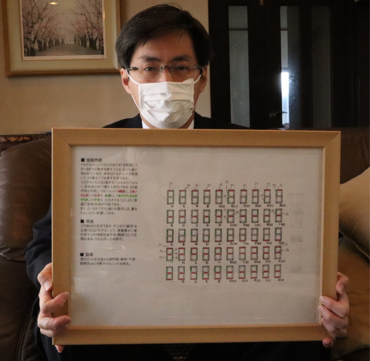 つつじが丘在住の鈴木誠一郎さん(50)がその人。ビデオデッキなどのデジタル数字を見て、かな表記に活用できないかと考案。7画からなるデジタル表記で母音と子音を決め、その組み合わせで50音を表現。韓国のハングル語のようにパターンをつかめば誰でも簡単に覚えられるのが特徴で、2000年に特許も取得した。