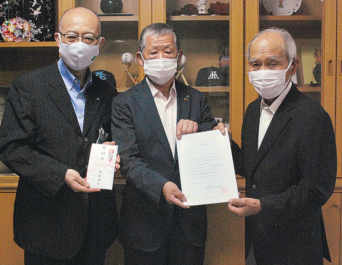 元JA神奈川県中央会・連合会会長の志村善一さん(81)=黒須田在住・写真右=が6月14日、青葉区役所を通じて区社会福祉協議会に100万円を寄付した。