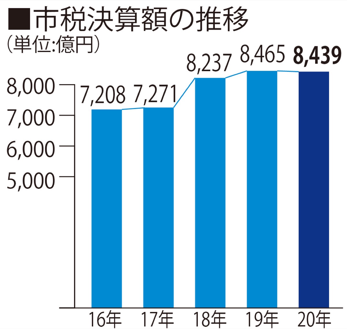歳入をみると、個人市民税は19年度比で42億円増の4136億円で過去最高を記録。市財政局によると、給与所得納税者が増加したほか、1人あたりの給与所得増が影響した。固定資産税と都市計画税も新築・増築の増加により合わせて約42億円の増収になった。