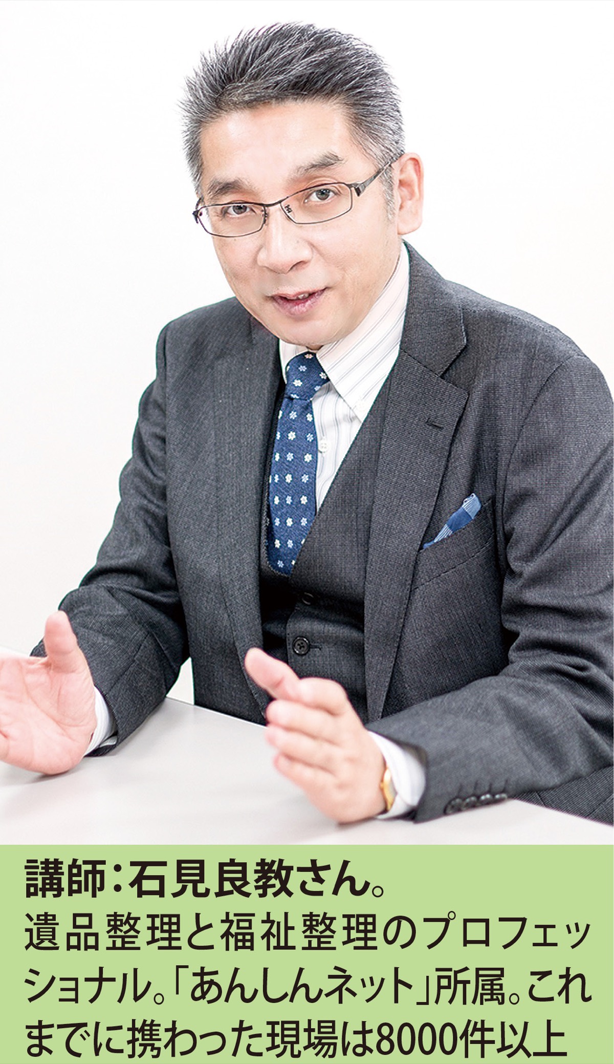 元気なうちに家を整理しておきたいと考えている人にぴったりの同セミナー。講師は「遺品整理人」として人気の石見良教さん=写真。石見さんによると一般家庭でも5〜6tの家財があり、子どもが仕分けながら片付けるのは非常に困難。終活や将来住みやすい場所への転居を見据えているなら少しずつ始めるのが良さそうだ。当日は片付けのコツや注意点なども解説。「生前整理は心の整理。ぜひ片付けのヒントを聞きに来てください」と石見さん。小冊子のプレゼントあり。