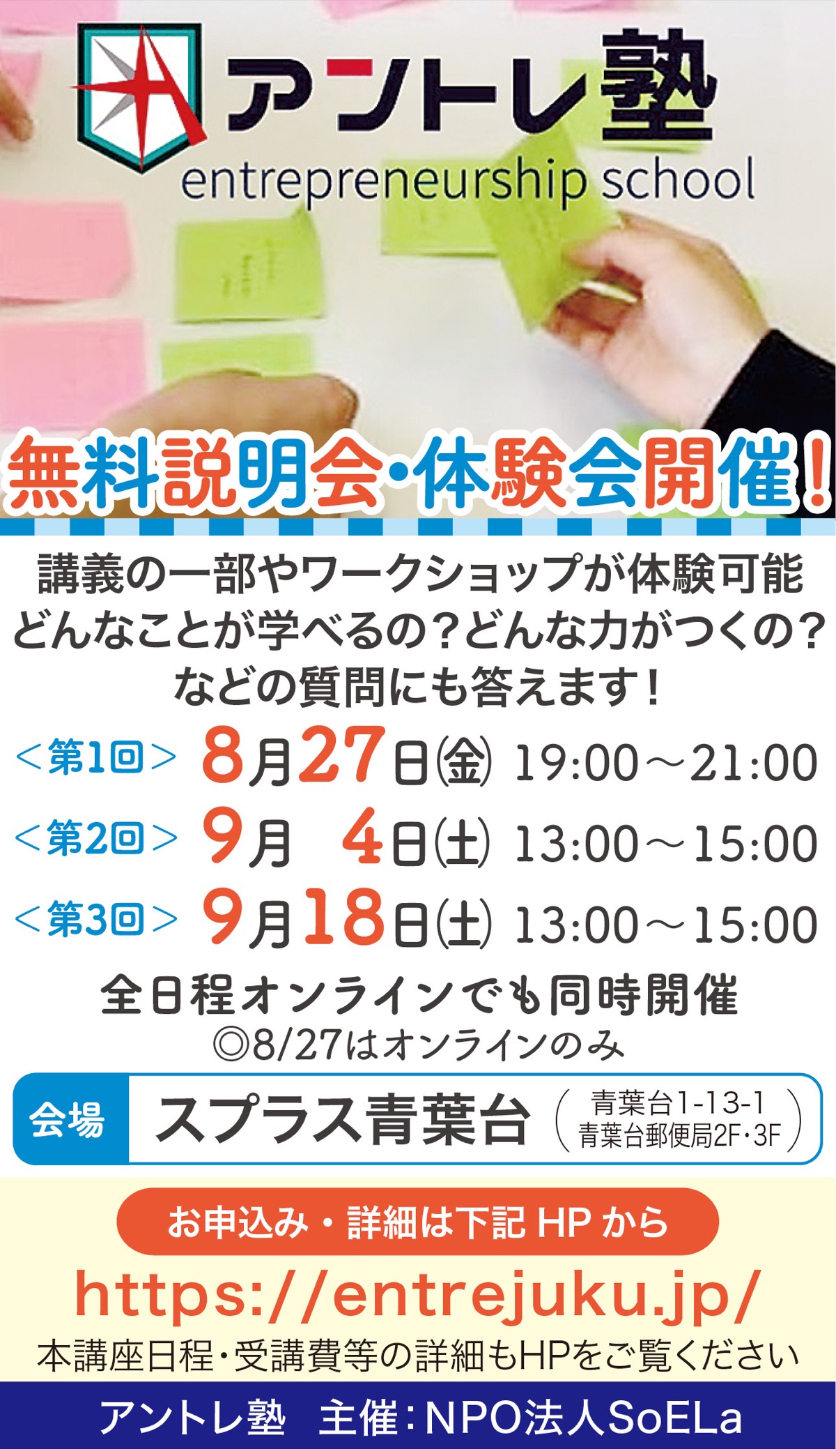 高校時から「課題発見・解決能力」などを養うための塾「アントレ塾」が10月14日(木)、スプラス青葉台に開校する。