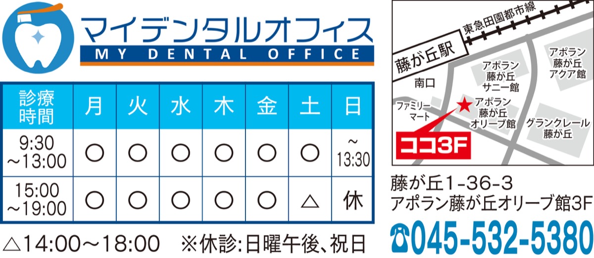 藤が丘駅南口徒歩1分に「マイデンタルオフィス」が新規開院。地域のかかりつけ歯科医院となるべく、祝日を除く毎日診療。日曜も午後1時30分まで診療している。