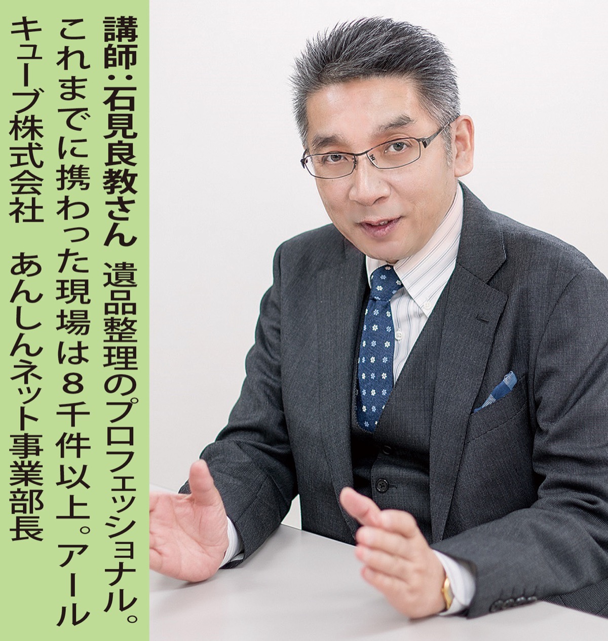 衣類や家具、思い出の品々をどうしようか困っている人に最適な同セミナー。講師を務めるのは「遺品整理人」として人気の石見良教さん=写真。一般家庭で5〜6tと言われる家財は、元気なうちに少しずつ片付け始めるのが肝要。身軽になって将来を前向きに考えるためのセミナーだ。「生前整理は心の整理。ぜひ片付けのヒントを聞きに来てください」と石見さん。セミナーは3組(1組2名まで)限定。事前予約制、下記まで要申込。参加者には小冊子進呈。同住宅への移動手段は相談を。