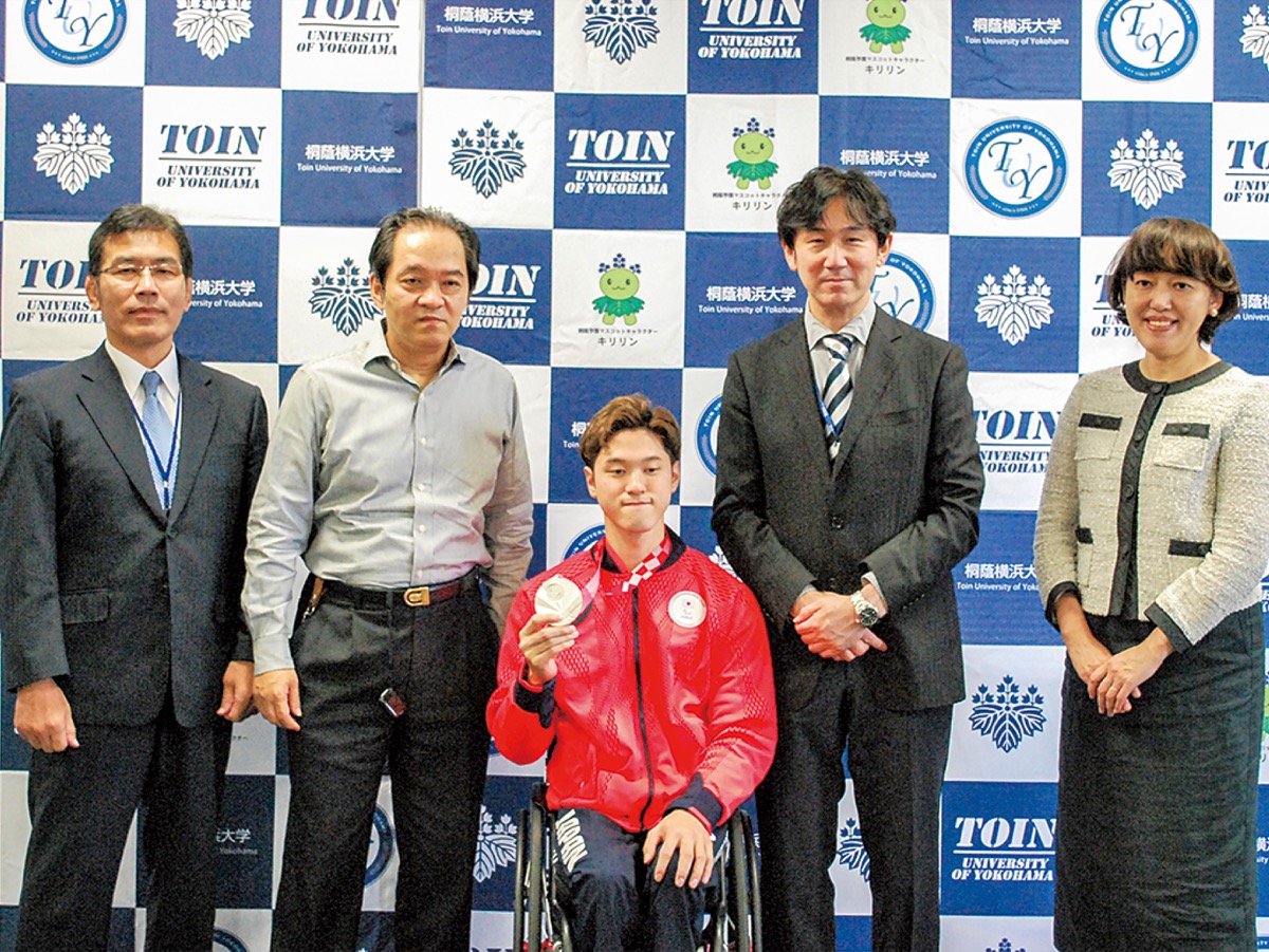 東京パラリンピック車いすバスケットボール男子で、銀メダルを獲得した古澤拓也選手(25)=(株)WOWOW所属=が9月16日、母校の桐蔭横浜大学を表敬訪問した。