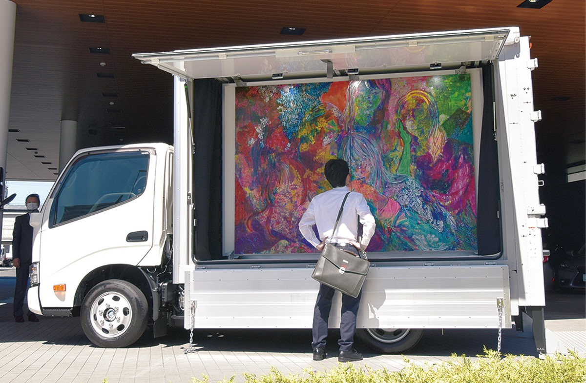 文化芸術を贅沢品ではなく、生活に必要不可欠なものと捉え、誰もが作品に触れられる機会の創出を目的とする同財団。今年7月には移動型ギャラリー「アート・トラック」=写真=を使い、絵画や立体作品など現代アートの出張展示を無償で開始したが、感染症の拡大を受けて活動は苦戦している。同財団は密になりづらい屋外展示もできるメリットを伝えながら、出張できる場所を探しているのが現状だ。
