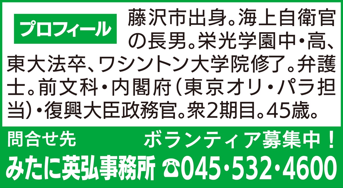 私、みたに英弘には「中間層を取り戻す」ための政策を実現する責任と実行力があります。野党のように「言うだけ」で終わらせることはありません。皆さまの力を頂きながら、全ての人が豊かな暮らしを実感できる社会を実現して参ります。