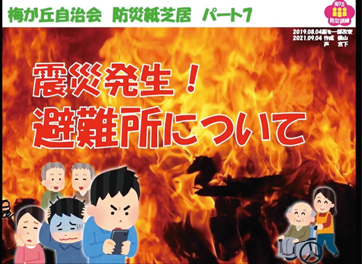 梅が丘自治会(佃小夜子会長)が防災の取り組みに力を入れている。コロナ禍で防災訓練などが出来ない中でも、独自の動画「防災紙芝居」などを作成して発信し、住民に災害への備えを呼びかけている。