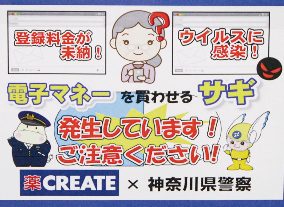 これは県警本部が(株)クリエイト エス・ディー(本社/青葉区荏田西)に協力を要請し、県内約380店舗で実現したもの。ステッカーは同社が作成したA6サイズ(縦10・5cm×横14・8cm)で、レジ前の飛沫防止シートに貼られている。「登録料金が未納」「ウイルスに感染」などと騙り、電子マネーを買わせる詐欺が発生していることを伝え、注意を促す内容だ。また、一部店舗ではレシートでも詐欺への注意を記載している。