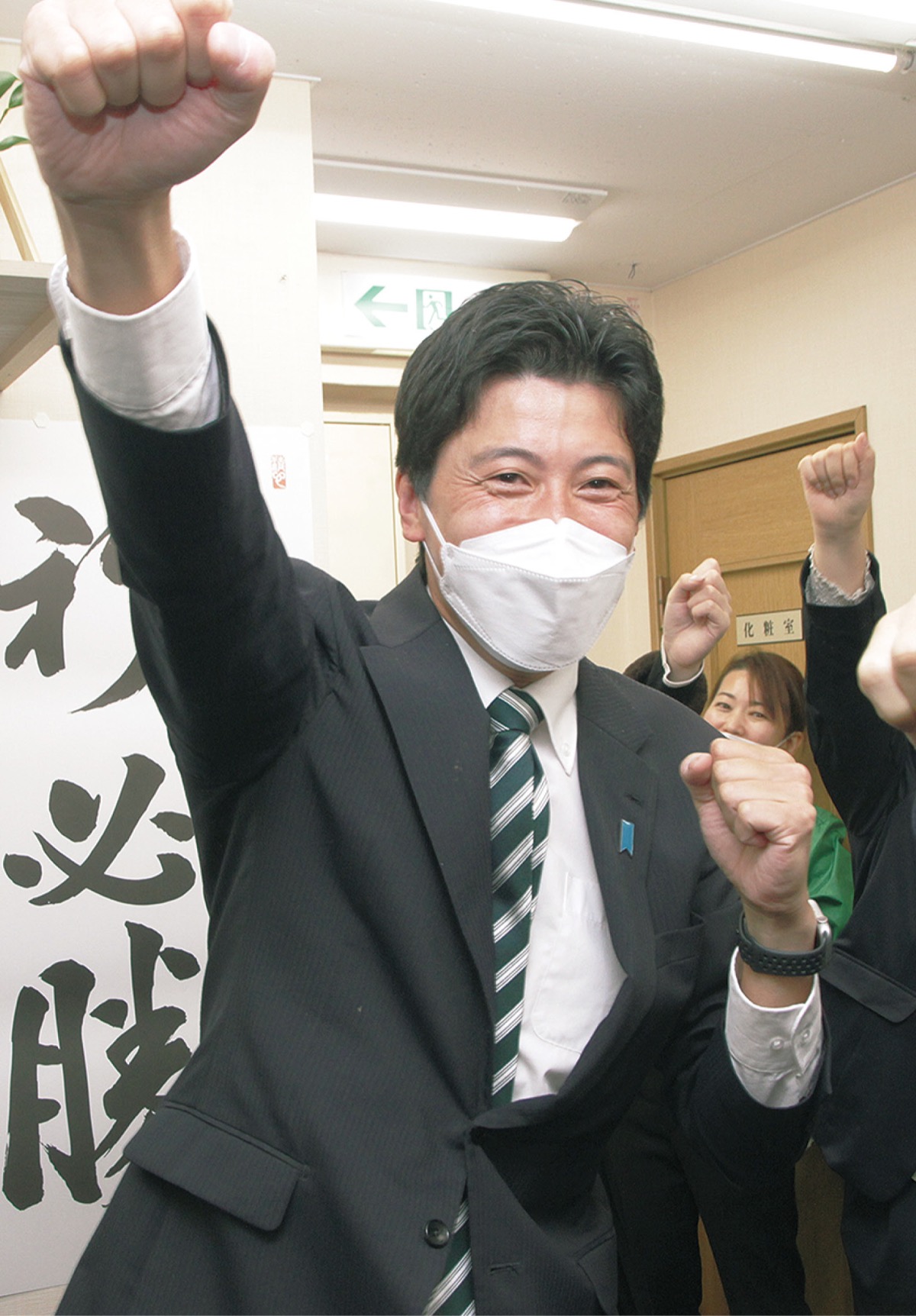 当確に沸く事務所には山中竹春市長が訪れ、祝意を述べる場面も。江田氏は「市政をがらっと変えたのは有権者の皆さんの力。今度は国政をがらっと変えましょう」と呼びかけていた。