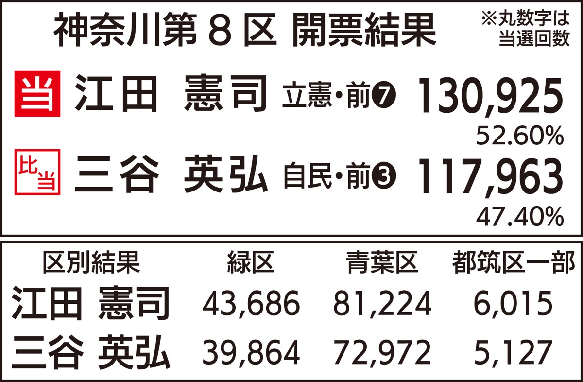第49回衆議院議員総選挙が10月31日に投開票され、神奈川8区(緑区・青葉区・都筑区の一部)では、立憲民主党代表代行の江田憲司氏(65)が約13万票を獲得し、7選を果たした。一方、小選挙区で敗れた自民党の三谷英弘氏(45)は、前回に続き比例代表南関東ブロックで復活当選した。