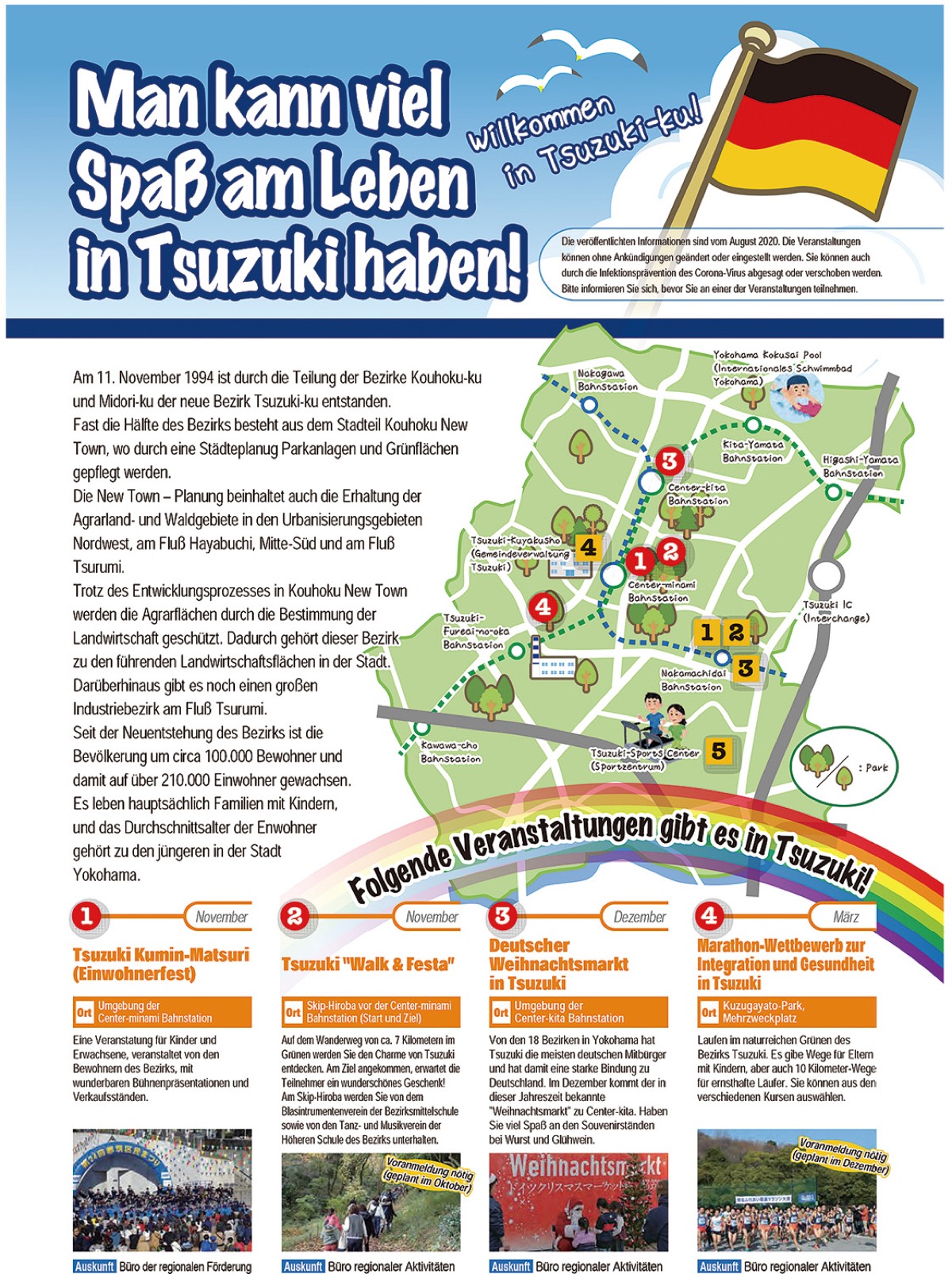 昨年9月には都筑の魅力をまとめたリーフレットをドイツ語表記で発行。地産地消サポート店や区のイベントを紹介している。