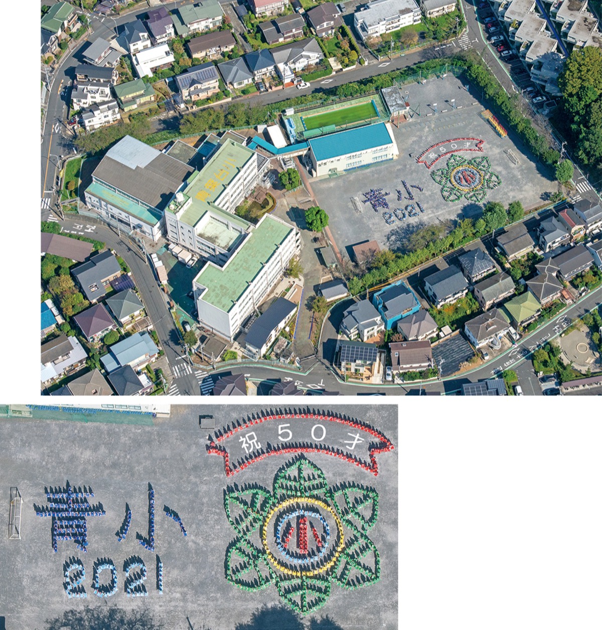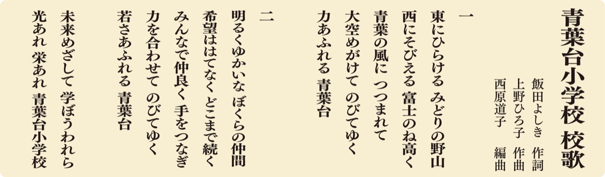 そんな同校は1971年6月につつじが丘小から独立して開校。74年には「正しく、強く」学んでいこう、との思いを込めた校章が制定されている。校歌の制定は91年の創立20周年を機に行われたものだが、73年度に集会のための愛唱歌として児童と保護者から募集し、以来歌い継いできた曲が元になっている。