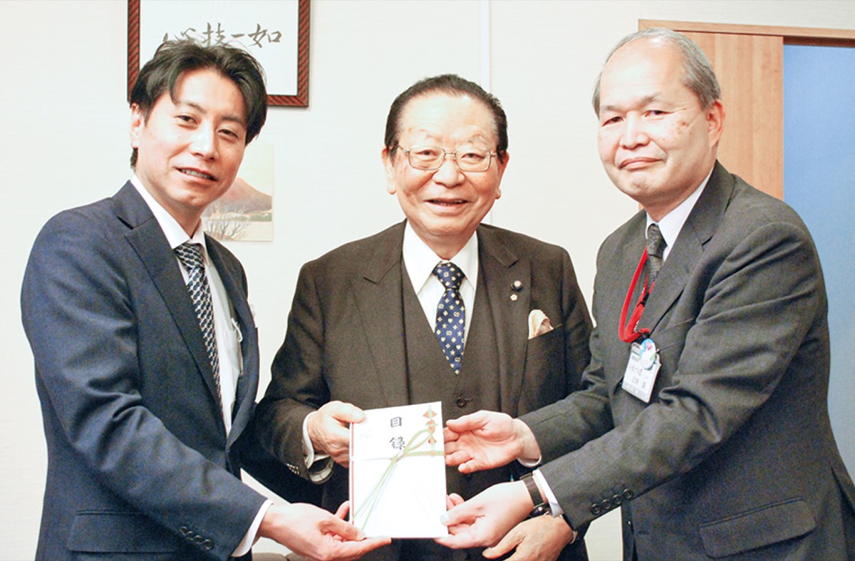 平元周院長の代理として寄付を受け取った岩坪新事務長は「前回に続き大変ありがたいご寄付をいただいた。地域医療を守るため、更なる感染対策のために活用させていただきます」と感謝を述べた。横田支店長は「地域貢献は私たちの務め。コロナは第6波も懸念され、医療従事者の方々は気が休まらないと思う。今回の寄付が少しでも皆さんの力になれば」と語った。