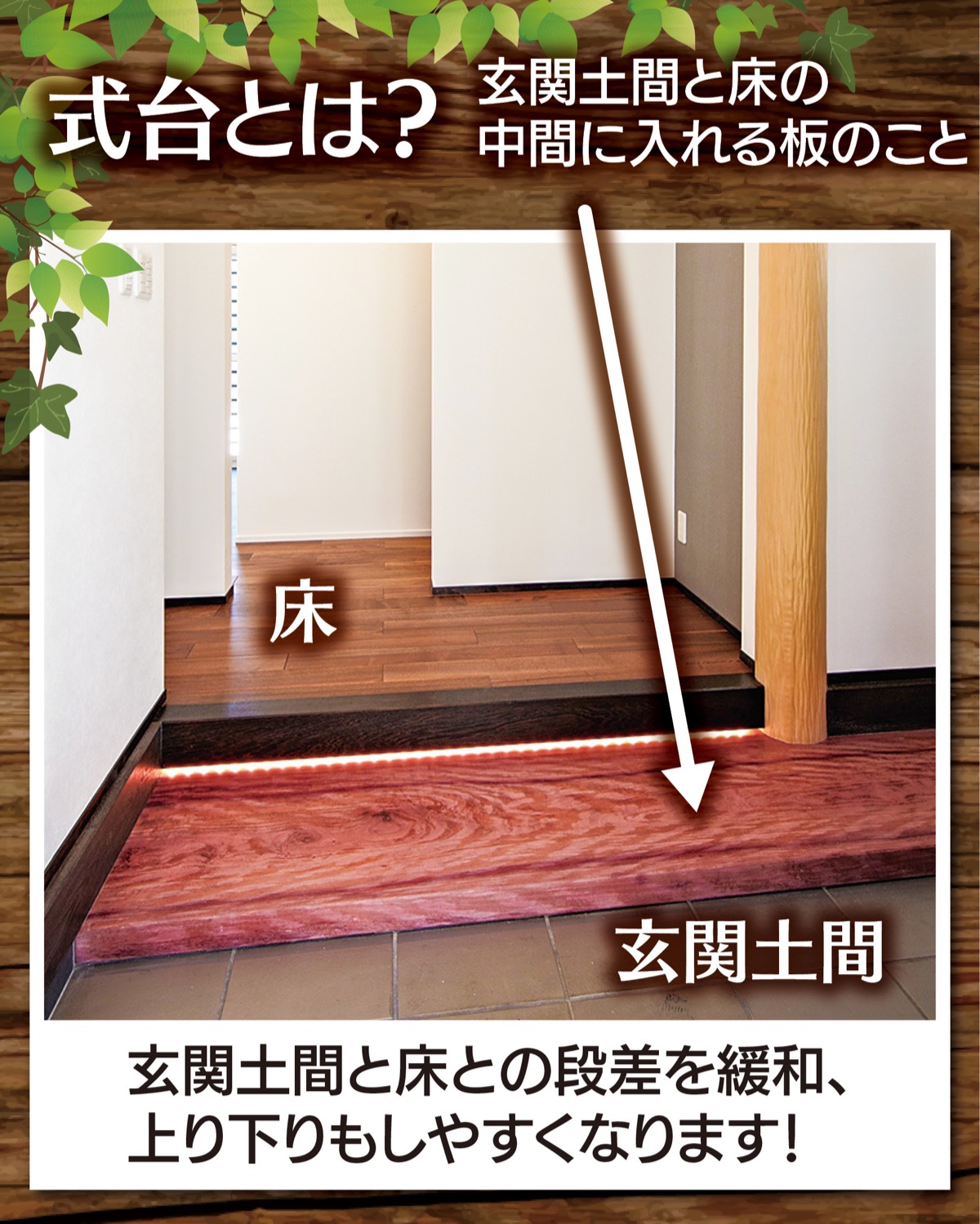 今回紹介するのは玄関へのこだわり。同社が施工するほとんどの注文住宅で、取り付けているのは、式台だ。式台とは、玄関土間と床の中間に入れる板のことで、最近では、新築住宅でも見かけることが少なくなった。