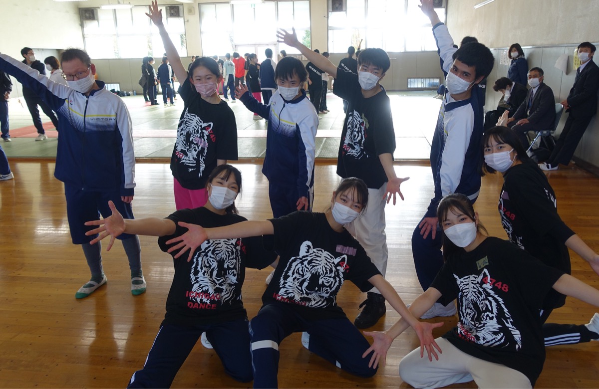 当日は、同部がダンスを披露した後、曲に合わせて動きをまねるリズムゲームを行った。また、最後には両校の生徒が混ざって6つのチームに分かれ、同部が振付を指導。嵐の『GUTS !』に合わせて発表会を行った。