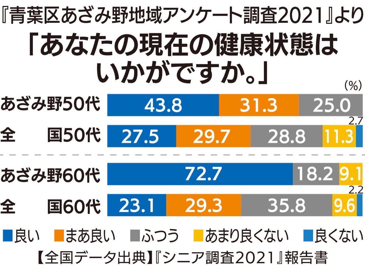 50代・60代の回答者を抽出し、全国調査と比較しながら健康等の実態も調査。健康状態を尋ねる質問では、あざみ野の50代は75・1%、60代は72・7%が「良い」「まあ良い」と回答。全国調査の57・2%、52・4%を大きく上回った。