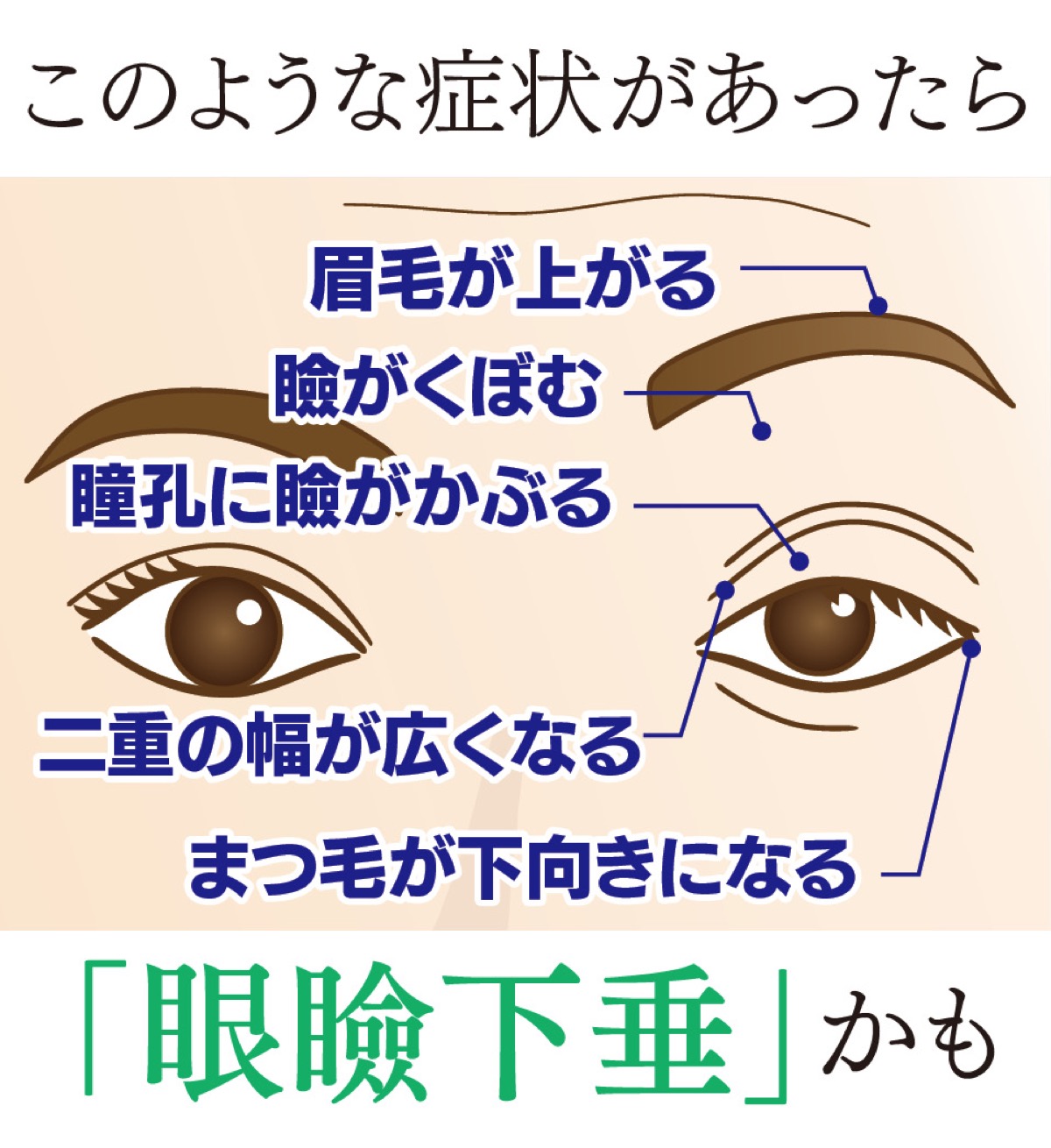 瞼の下りが強くなると重たさや見えにくさが出るだけでなく、無意識に額の筋肉を使って瞼を上げようとするので、眉毛の位置が上がってしまい、額のシワが強く出たり、頭痛や肩こりにつながる方もいます。二重の形にも影響し、二重の幅が広くなり、皮膚弛緩では二重が消え一重になることもあります。