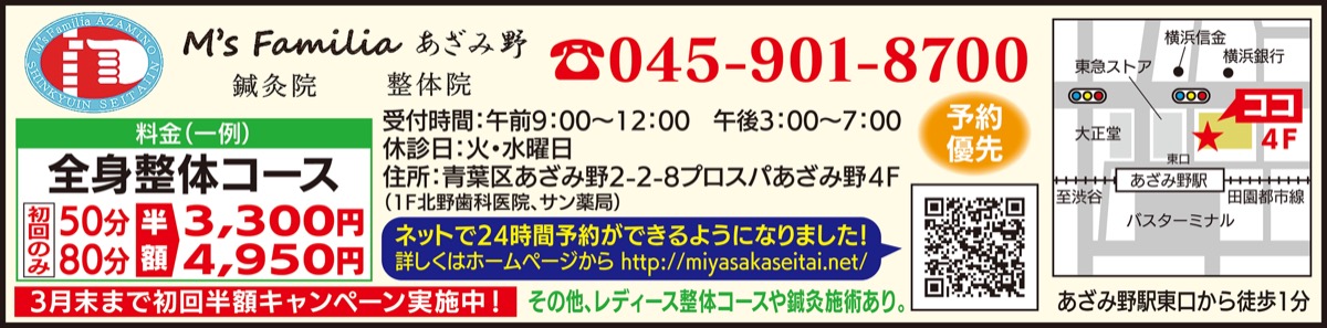 骨格を知り尽くし、これまで20万人以上を施術してきた「M's Familia あざみ野 鍼灸院整体院」が、あざみ野駅徒歩1分の通いやすい場所に移転して今年で開院15周年を迎える。昨年末には院名と院内をリニューアル。明るく、プライバシーを確保したゆとりある個室で施術を受けられ、感染対策にも注力している。
